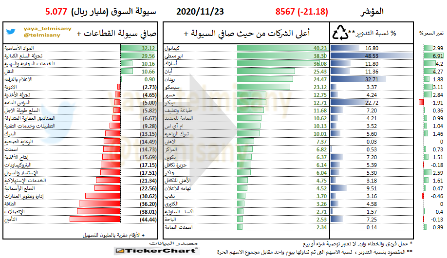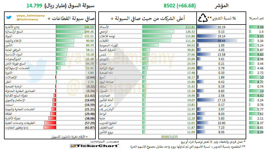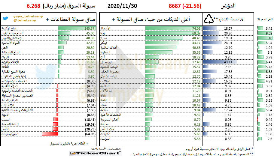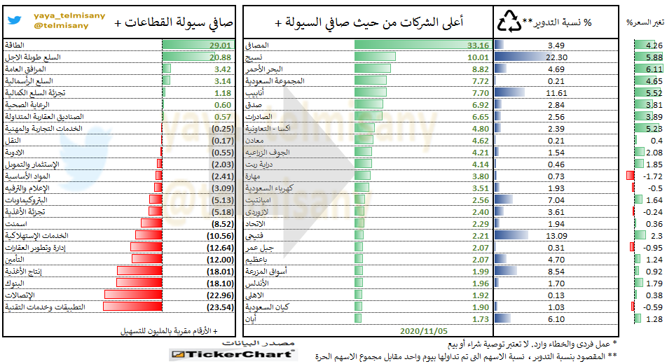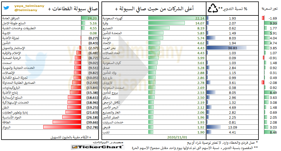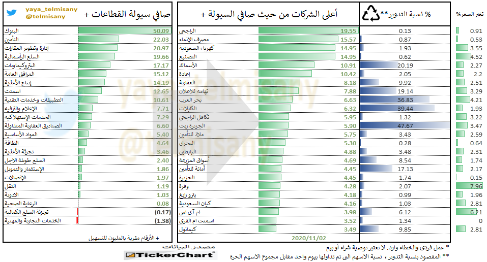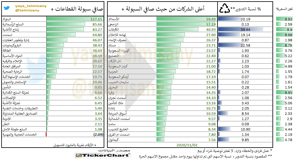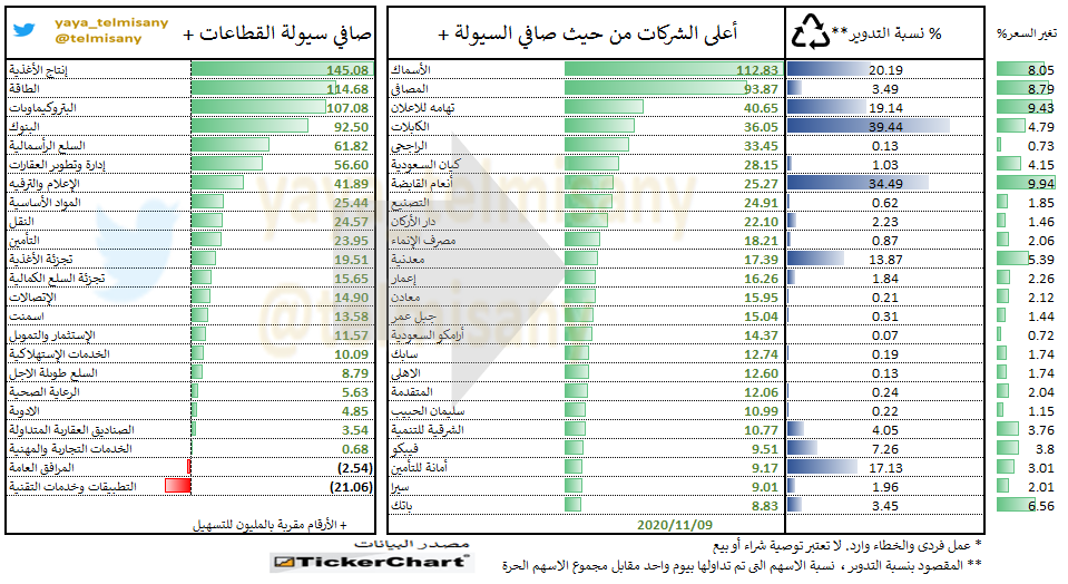 قطاع انتاج الأغذية الأعلى من حيث صافي السيولة وقطاع التطبيقات وخدمات التقنية الأقل. ونسب تدوير عالية في بعض الأسهم كما هو موضح في الجدول