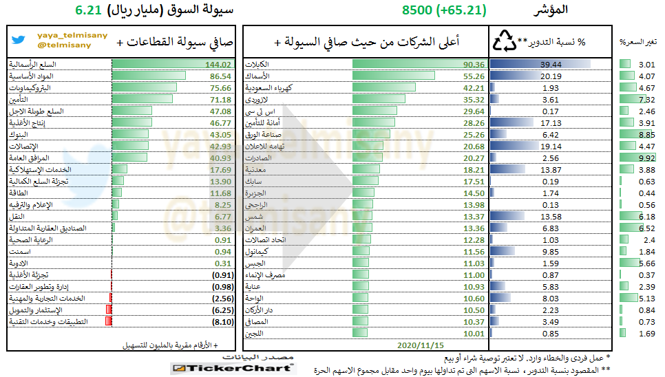تحسن كبير وواضح في صافي سيولة جميع القطاعات اليوم. لكن يلاحظ نسب تدوير عالية في كثير من الاسهم (سيولة مضاربية)