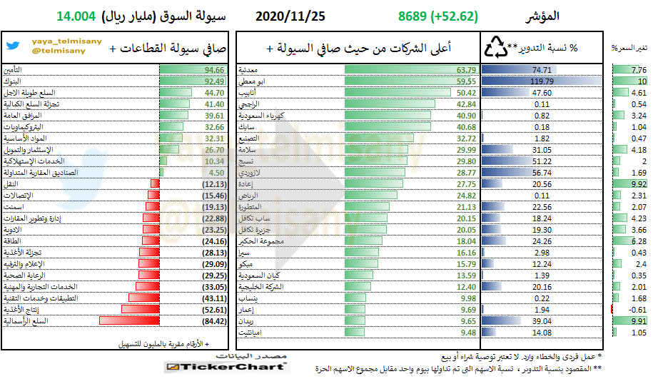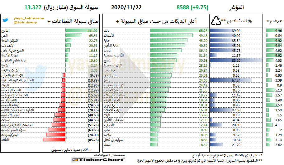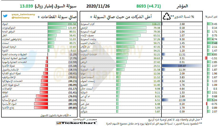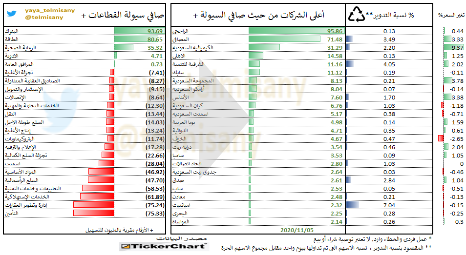 البنوك و البتروكيماويات الأعلى من حيث صافي سيولة القطاعات. سيولة لافتة في سهم كيان السعودية. ونسبة تدوير عالية جدا في ريدان 135% !!