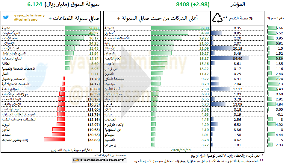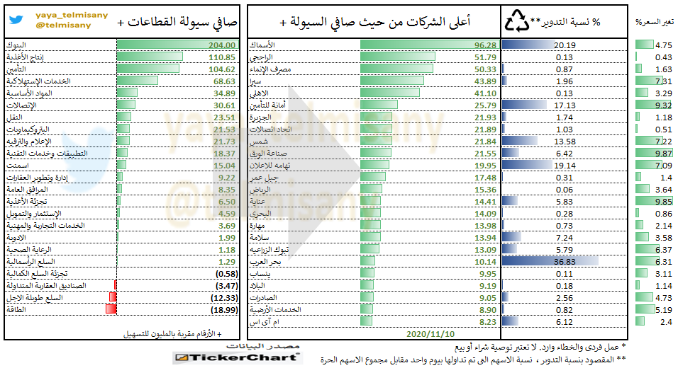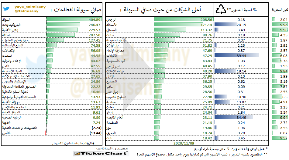 سيولة السوق 11 مليار ، وقطاعات انتاج الاغذية والأعلام الأعلى من حيث صافي السيولة. سيولة ساخنه (تدوير عالي مع سيولة عالية) في عدة اسهم كما في الجدول