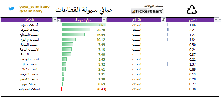 قطاع الأسمنت الأعلى و تجزئة الأغذية الأقل من حيث صافي السيولة. والمصافي الأعلى من حيث صافي سيولة الشركات.