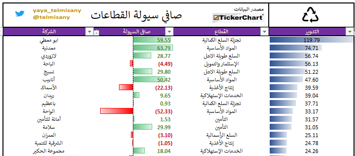 البتروكيماويات الأعلى و التأمين الأقل من حيث صافي السيولة. ويلاحظ نسب تدوير عالية في بعض الشركات (اكثر من 80%)