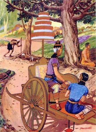 بمناسبة الاحتفال بعيد الحصاد أتاح له والده الخروج من القصر والتجول في أرجاء المملكة، فإذ بعالم آخر تماما ينتظره، إذ مر أثناء سيره في الطرقات، برجل أرهقه المرض، ومسن أوهنه الكبر، وجثمان في طريقه إلى المحرقة، ثم برجل حليق الرأس بسيط الملبس قد تحرر وانطلق سائحًا في الأرض.