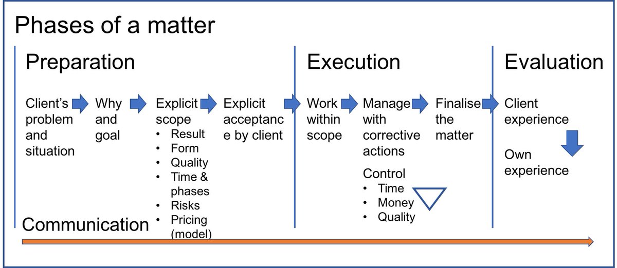 يستفيد المحامون من ذلك لتغذية مهارات "إدارة المشاريع القانونية" (LPM) لما لها من أثر على تحسين العمليات بين العميل والمحامي لادارة المراحل الثلاثة للعلاقة: