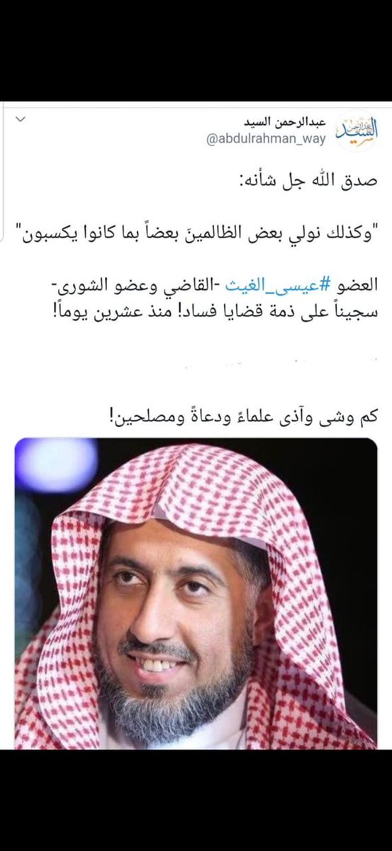 القبض على #عيسى_الغيث لاستيلائه على أراضي تقارب ٢٠٠ مليون متر مربع ورشاوى وهو قاضي وعضو مجلس شورى ودائماً يستفز المجتمع بأفكاره.