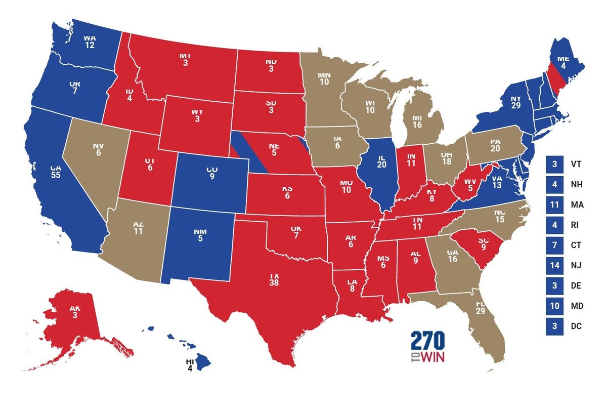 بما أن كل ولاية تتمتع باستقلال سياسي (محدود) يجعل تشكيلها الاجتماعي ووضعها الاقتصادي مختلف ومميز، فإنه قد تكون بعض الولايات مضمونة لأحد الحزبين الرئيسيين: الحزب الجمهوري اليميني المحافظ، أو الحزب الديموقراطي اليساري التقدمي الليبرالي