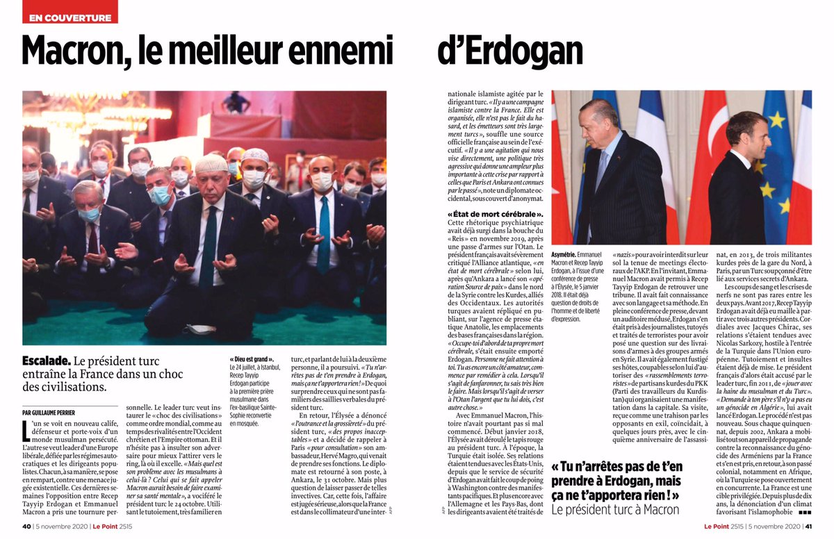 أخيرا .. تقوم المجلة بالهجوم على #تركيا وأردوغان التي تقول " بعدما ذكرت مواقف كل دول العالم منها " .. أنه يجر #فرنسا إلى صدام الحضارات ، كما كان في أيام التنافس بين الغرب المسيحي والإمبراطورية العثمانية !!