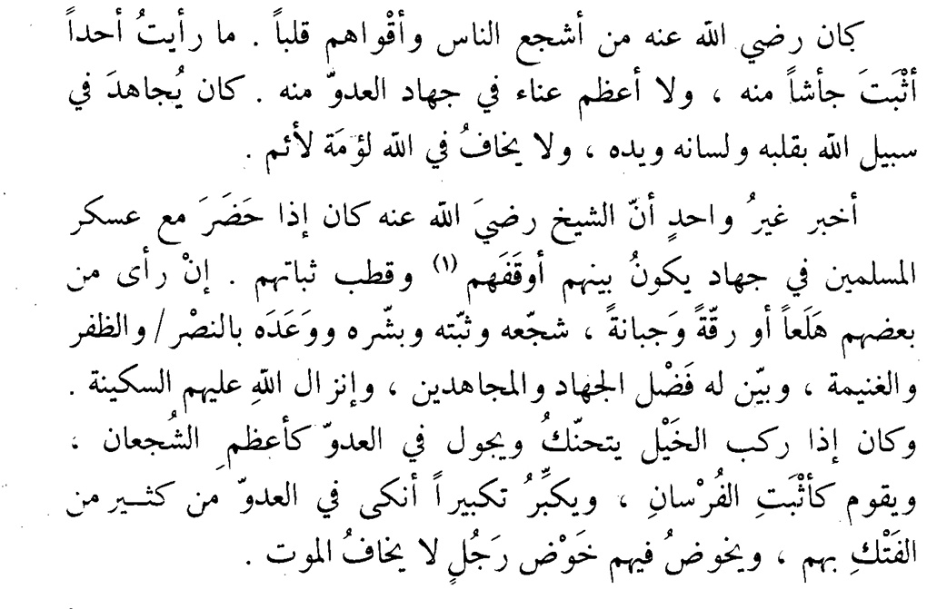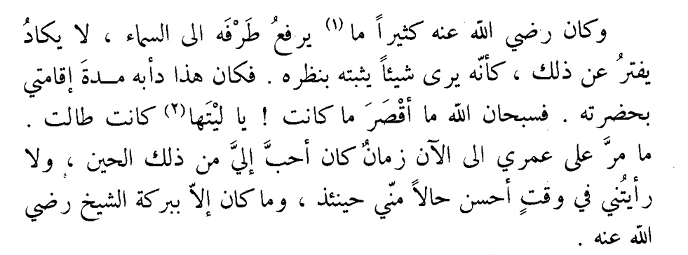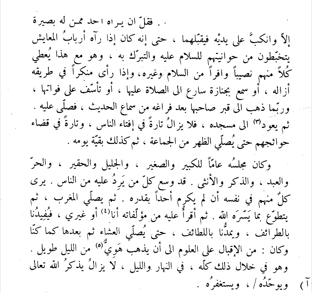 وهو مع ذلك يجري كما يجري السيل ويفيض كما يفيض البحر، من غير تعجرف ولا توقف ولا لحن بل فيض إلهي حتى يبهر كل سامع وناظر فلا يزال كذلك إلى أن يصمت، وكنت أراه حينئذ كأنه قد صار بحضرة من يشغله عن غيره ويقع عليه إذ ذاك من المهابة ما يرعد القلوب ويحير الأبصار والعقول