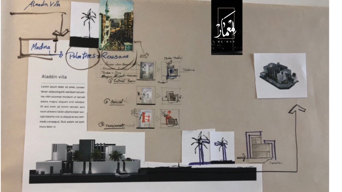 4️⃣بعد ذلك تم تفكيك النص المعماري لفهم خصائص المكان فالمبنى يقع في المدينة المنورة التي تمتاز بالنخيل و الروشان