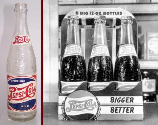على يد مديرها الجديد تشارلز جي غوث نهضت بيبسي من حطام الإفلاس، حيث لم تجد سبيلًا لإثبات وجودها سوى بطرحها ضعف الكمية التي تقدمها كوكاكولا بنفس الثمن، لم تعبأ كوكاكولا بمنافسها الصغير واستمرت في بيع زجاجتها الصغيرة بنفس الثمن دون تغيير.