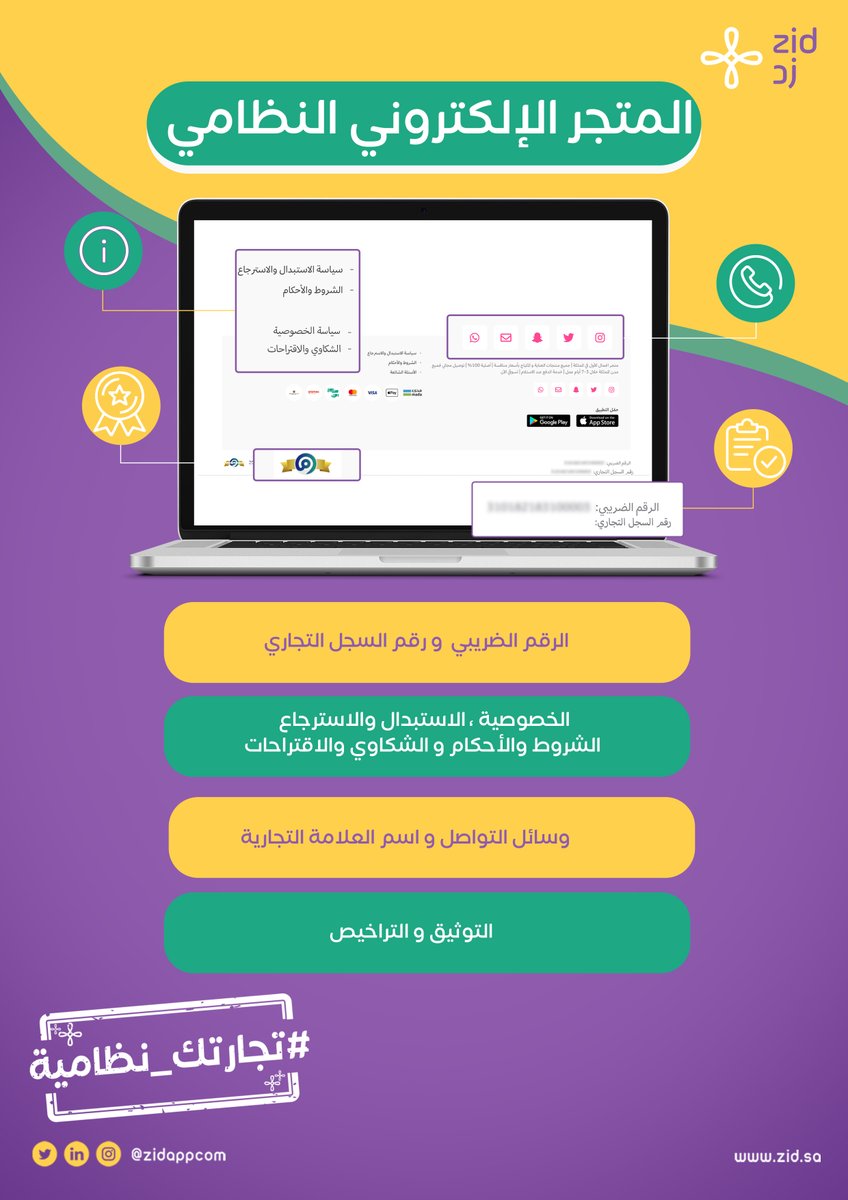 وإظهار رقم السجل التجاري عن طريق لوحة التحكم في متجرك. خطوات الإضافة: help.zid.sa