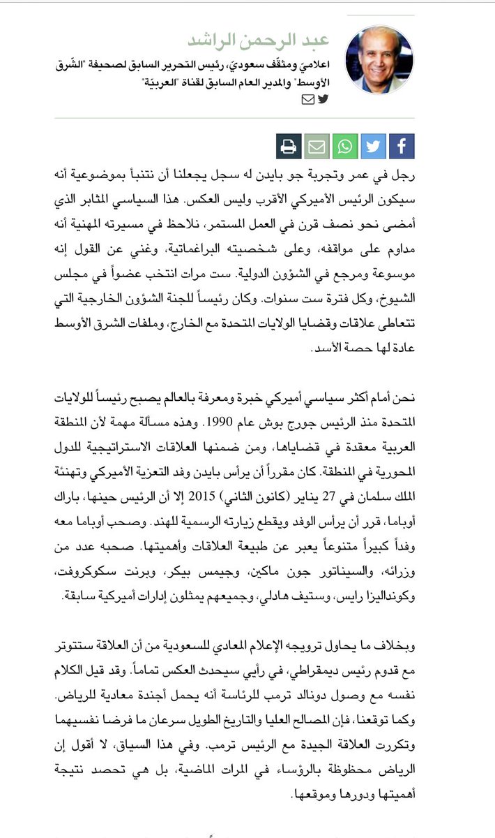 نحن أمام أكثر سياسي أميركي خبرة ومعرفة بالعالم يصبح رئيساً للولايات المتحدة منذ جورج بوش عام 1990. مسألة مهمة للمنطقة العربية المعقدة في قضاياها، وعلاقاتها الاستراتيجية مع الدول المحورية فيها.