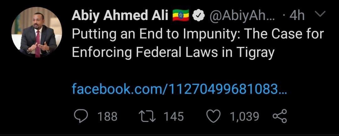 نزل رئيس الوزراء أبي أحمد بيان علي فيسبوك و تويتر بتنفيذ حملة عسكرية لتحرير الجبهة الشعبية في الشمال ضد حركة في الإقليم بسبب عدم مراعاه الخطوط الحمرا و تجاوز حدودهم👇