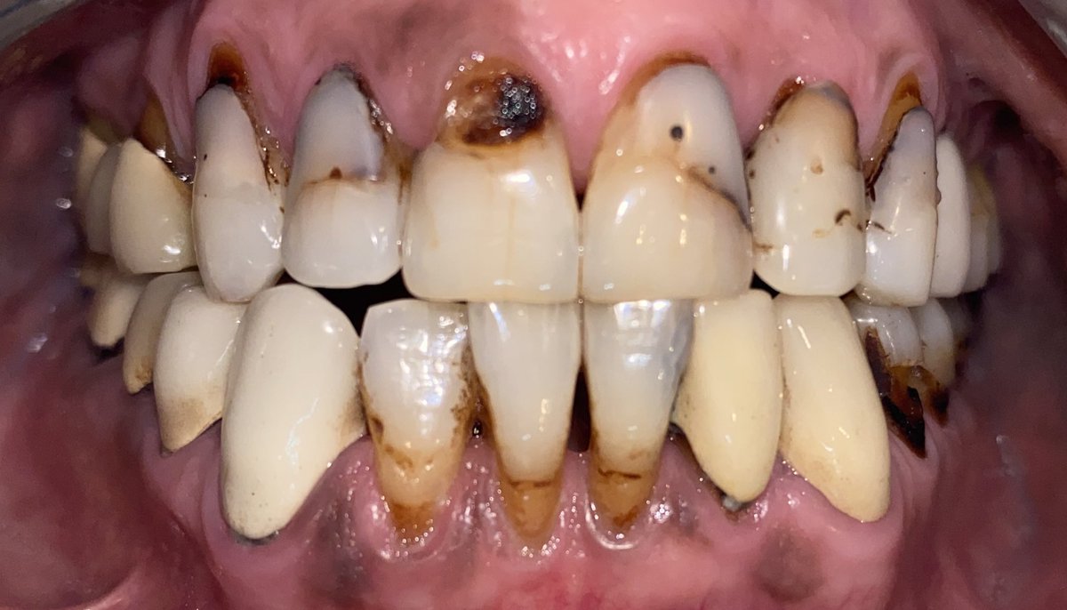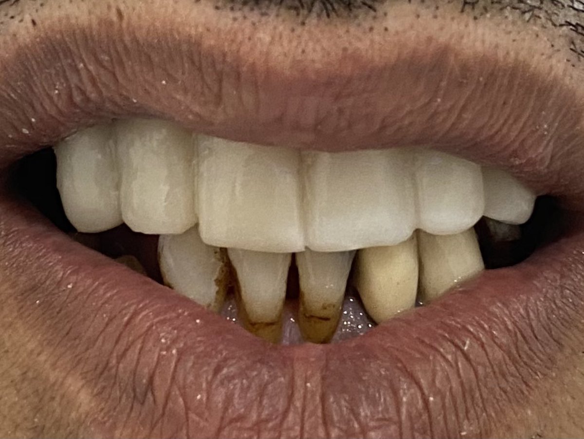 طبعا التلبيسات هذي فقط مؤقته ومتصله ببعضها وهي صوره طبق الاصل والشكل للاسنان الطبيعيه له ولكن النتيجه النهائيه لاحقا هي تلبيسات الزركون المنفصله كل سن على حده وبشكل جديد جمالي لتعديل الشكل السابق