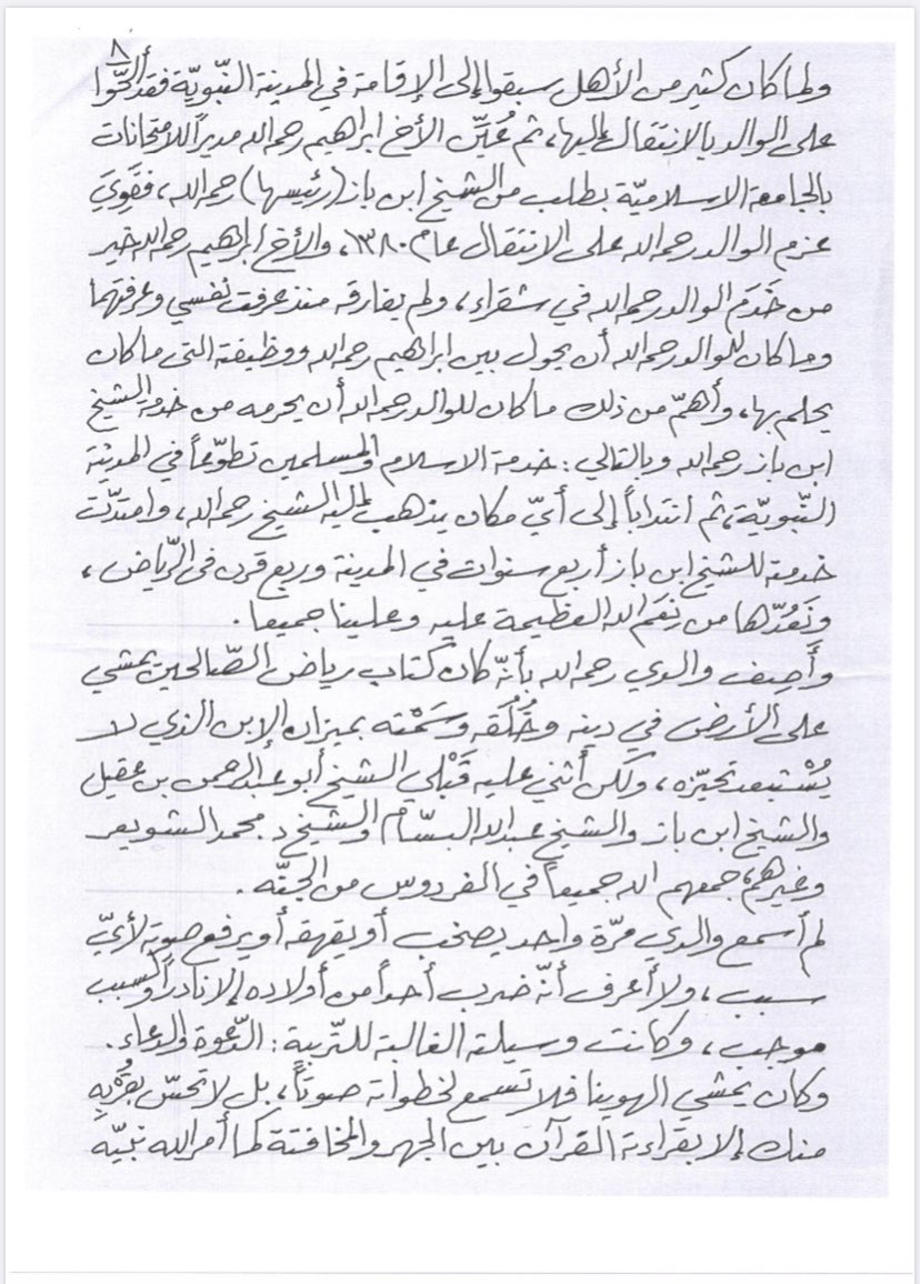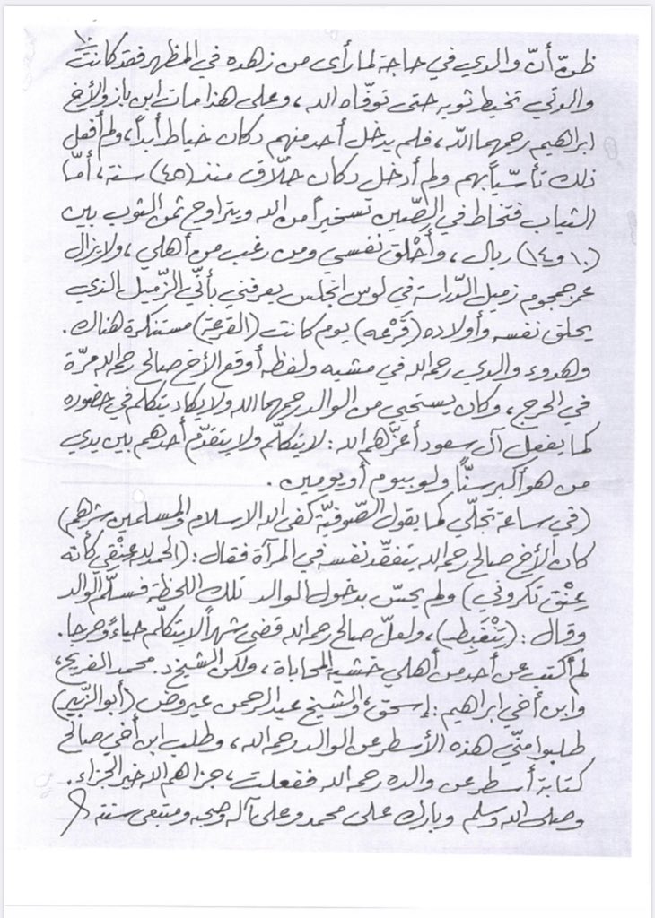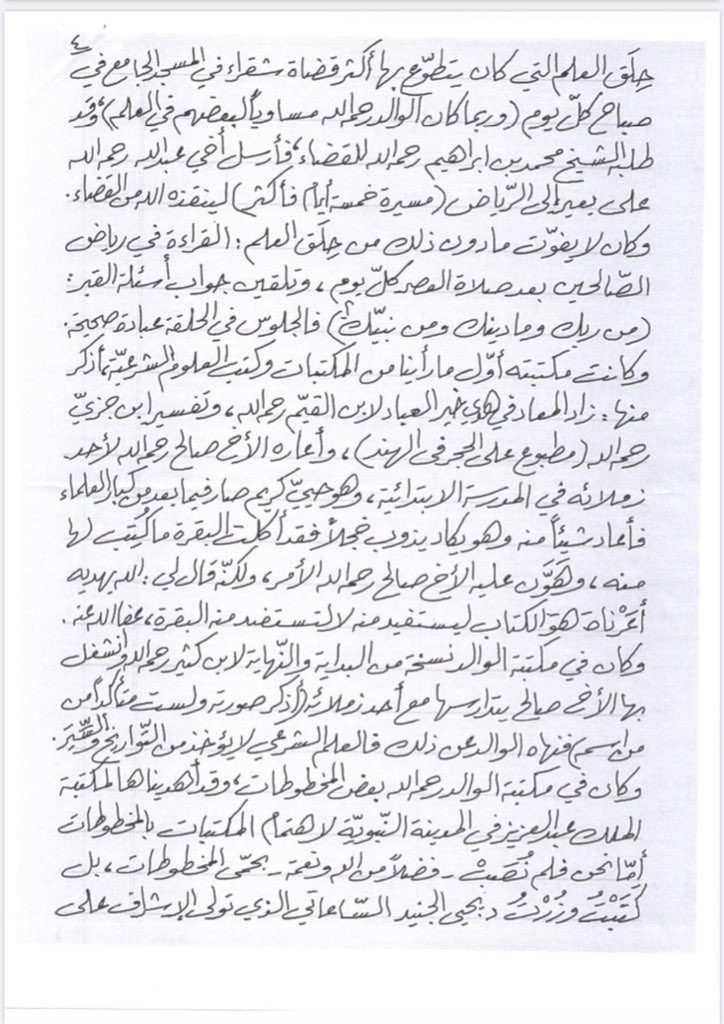 لقد كان خط الشيخ رحمه الله جميلا وكان موثوقا معتبرا لذا نجد ديوان الأوقاف بشقراء الذي أظهره الباحث يوسف المهنا جله بخط الشيخ يذكر ابنه عبدالله أنه مازالت عدة الشيخ موجودة لديهم فأتمنى أن توضع مع هذه السيرة في دكانه الذي أعيد بنائه في سوق المجلس وبعض إرث وتراجم هذه الأسرة المباركة