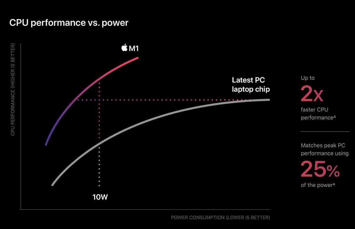 يستطيع المعالج الوصول لأقصى أداء لمعالج حاسوب شخصي باستهلاك 10 واط فقط، بينما يصل المعالج في الحاسوب الشخصي لأعلى أداء عند 45 واط استهلاك للطاقة. #مؤتمر_أبل