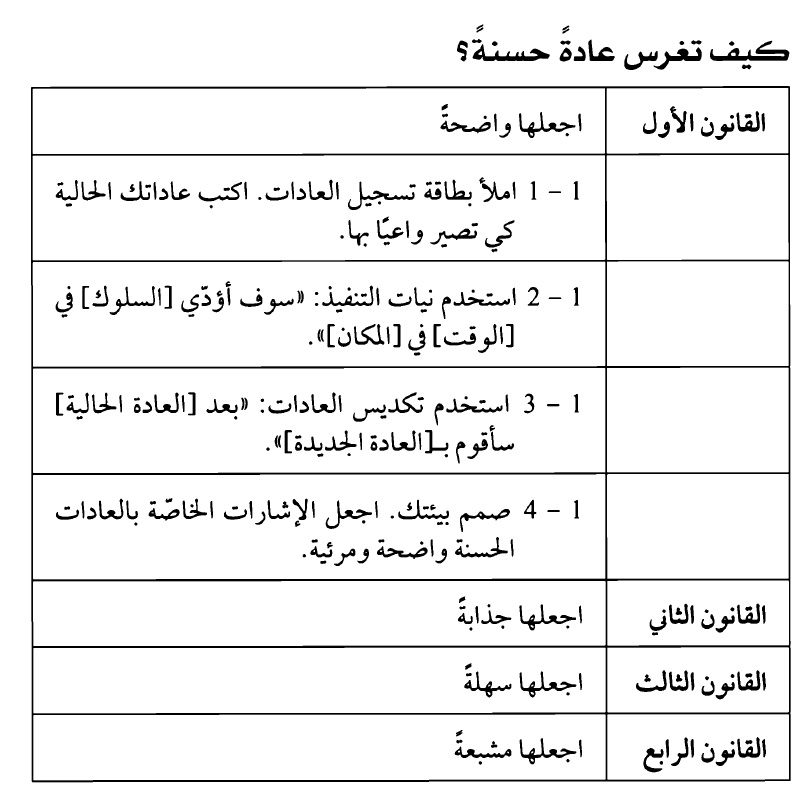 إن كل عادة لا تجلب لك نتائج وحسب وانما تعلمك ايضا شيئا اكثر أهمية وهي ان تثق بنفسك وقدرتك ع الانجاز.عاداتك نشكل هويتك وهويتك تشكل عاداتك. خطوات جديدة لتحقيق التغيير: