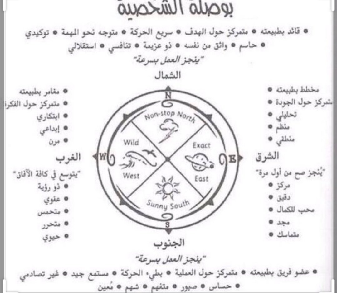 والغربي والشرقي والجنوبي طبعا لاعلاقه لها بالجهات، ولا بالاماكن، فالشمالي قائد ومتمركز حول الهدف، سريع الحركه استقلالي تنافسي واثق من نفسه، ينجز اعماله سريعا ،والجنوبي عضو في الجماعه بطيء الحركه مستمع جيد، حساس صبور شهم معين، والشرقي مخطط بطبيعته متمركز حول الجوده، تحليلي منظم