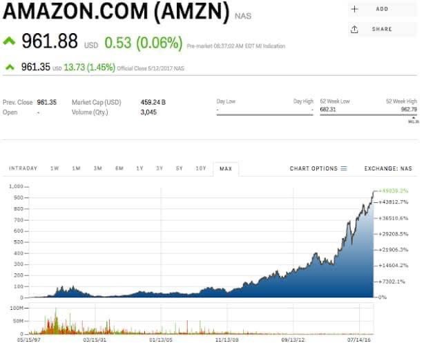 و في خلال شهرين كانت امازون بتبيع فوق ال20 الف كتاب في الشهر و لمدة سنة و نص و لحد أواخر 97 كان هدف امازون في النمو المتزايد و انطرحت في البورصة و كانت قيمة الشركة وقتها 400 مليون دولار من 300 الف ل400 مليون دولار و كانت أسهم أمازون و كل شريكات الانترنت بترتقع بسرعة لحد 99👇