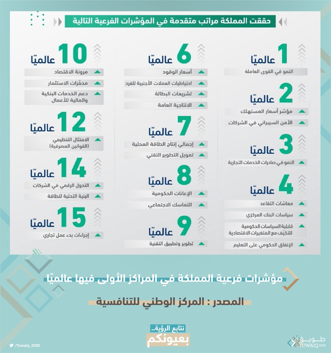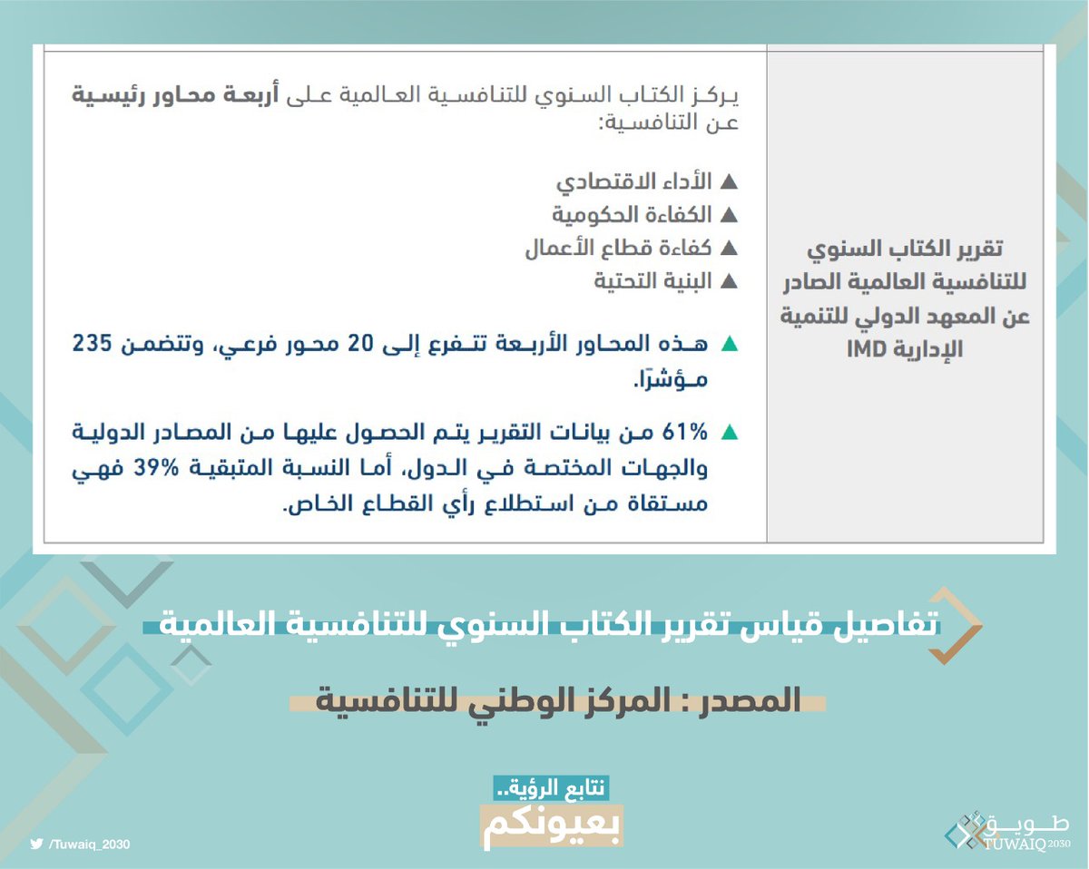 منذ إنضمامها عام 2017 في تقرير الكتاب السنوي للتنافسية العالمية الذي بدأ يقيس الأكثر تنافسية في العالم منذ 1989، المملكة في المرتبة 24 عالميًا في عام 2020 والثامنة بين دول #مجموعة_العشرين
