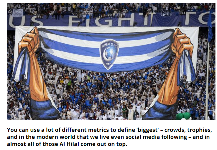 💥 موقع "theasiangame"| "#الهلال هو النادي الأكثر نجاحًا في السعودية، لديه أكثر من 12 مليون متابع مجتمعين على تويتر وفيس بوك وإنستجرام. الأكبر لا يعني دائمًا الأفضل لكن هذا المصير لم يتعرض له الهلال أبدًا. هو دائمًا عملاق".