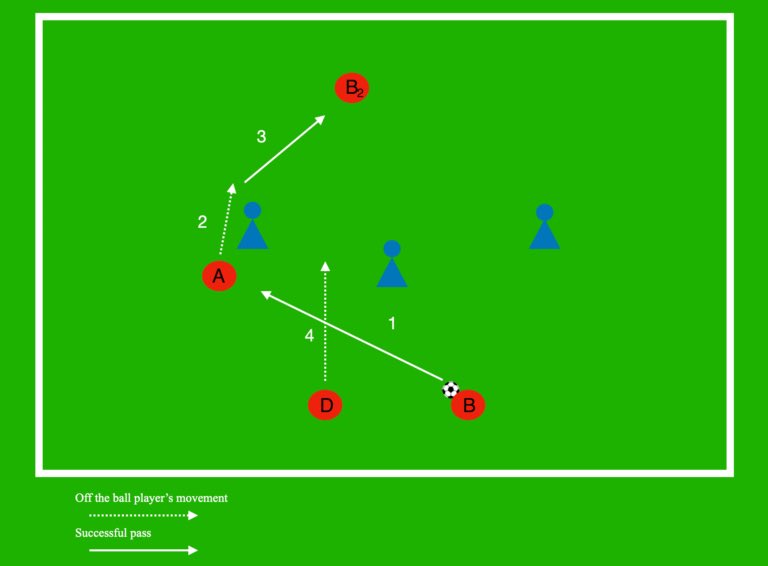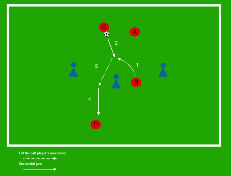 كون التمرين رائعًا للتدرب على التنقل بين الخطوط ، فإن هذا التمرين مفيدًا للعب الجماعي والدفاع ككتلة موحدة. يمكن للفريقين الدفاع ب3 لاعبين ضد 4 لاعبين متقاربين، لذلك ليس لديهم خيارات الا ان يكونوا متقاربين. لذلك يحتاجون إلى تتبع حركة 3 لاعبين خلفهم، فهذا يعطي توازن هجومي ودفاعي