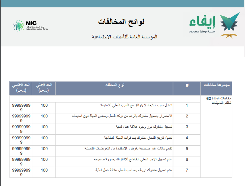 🔷تسجل مخالفات #التأمينات_الاجتماعية ( المادة 62 ) حالياً في المنصة الوطنية للمخالفات إيفاء