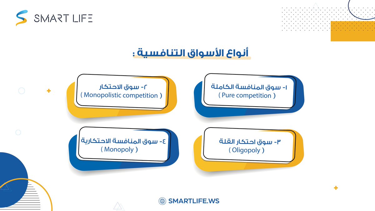 3-سوق احتكار القلة ( Oligopoly ): ويصعب الدخول والمنافسة في هذا السوق لقلة الإيرادات و زيادة الأسعار. ويختلف عن سوق الاحتكار بقلة وجود المحتكرين. أيضاً لا يعتمد على احتكار منتج او خدمة فحسب بل على مجموعة تجار أو موردين أو منتجين للمنتج، يحتكرونه ويشكلون الغالبية في السوق.