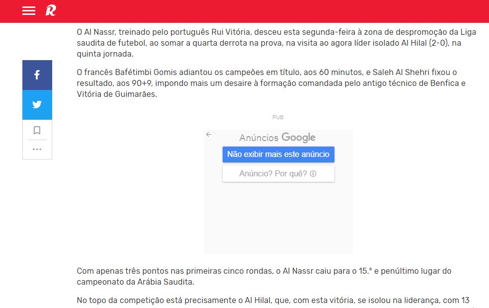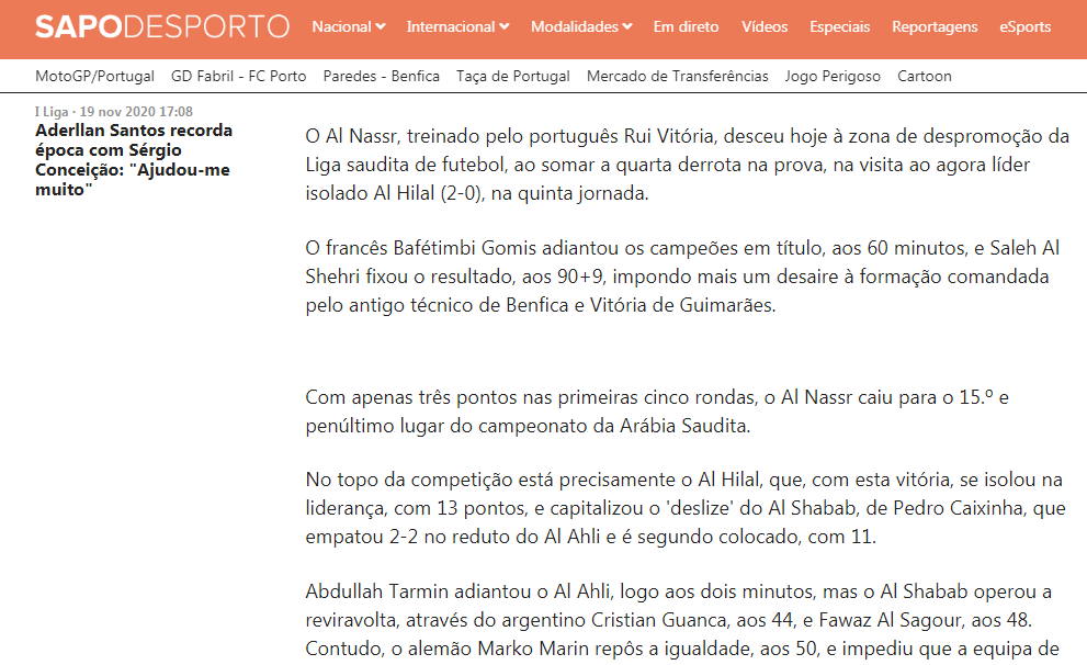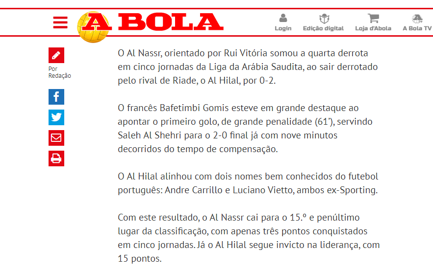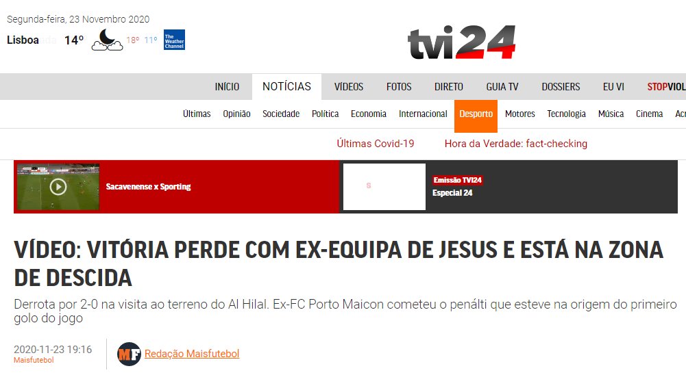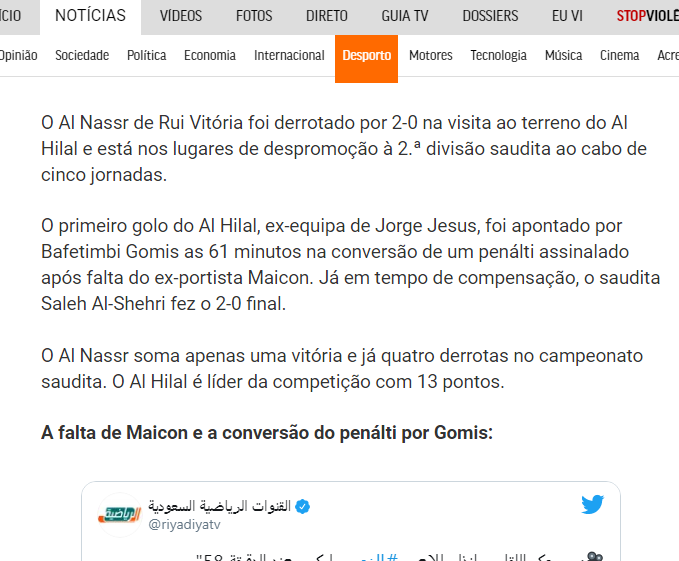 💥 قناة "tvi24" البرتغالية| "روي فيتوريا يخسر أمام الفريق السابق لخورخي جيسوس. #النصر ينهزم أمام #الهلال 2 ـ 0 وهو الآن في مناطق الهبوط بعد مرور 5 جولات من المسابقة بينما يتصدر الهلال المسابقة برصيد 13 نقطة".
