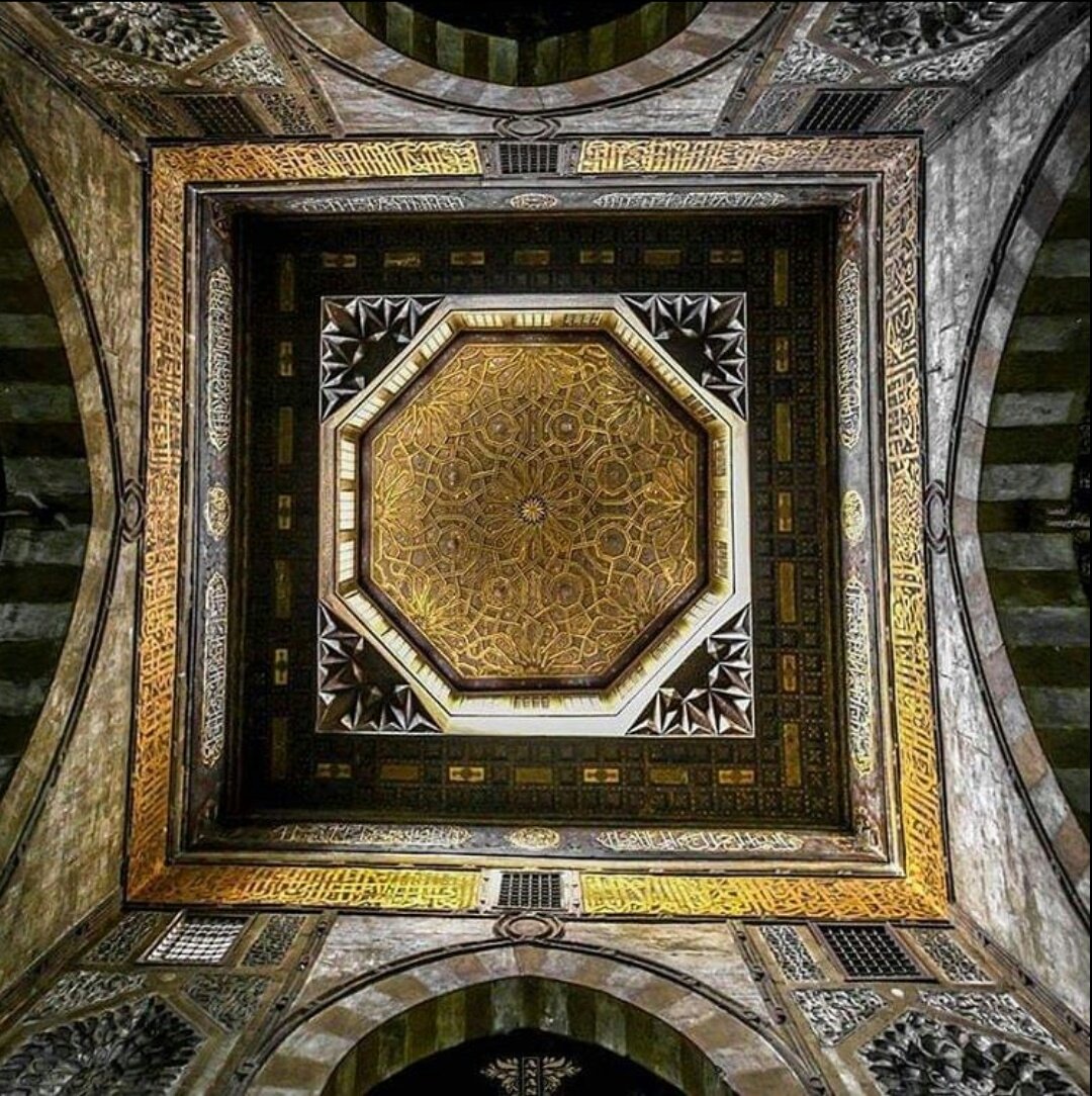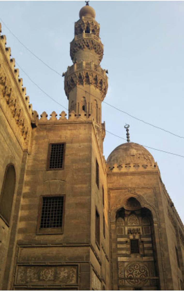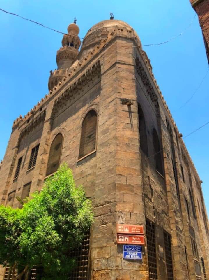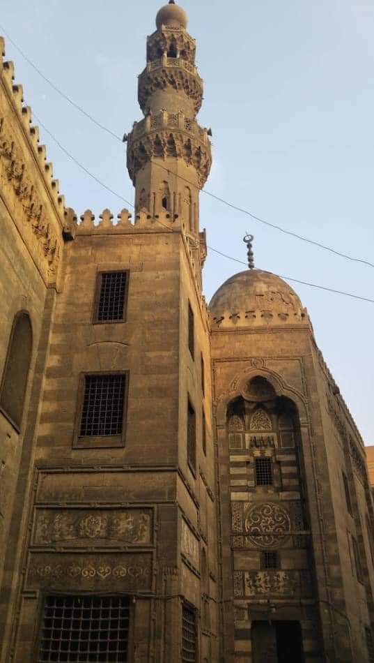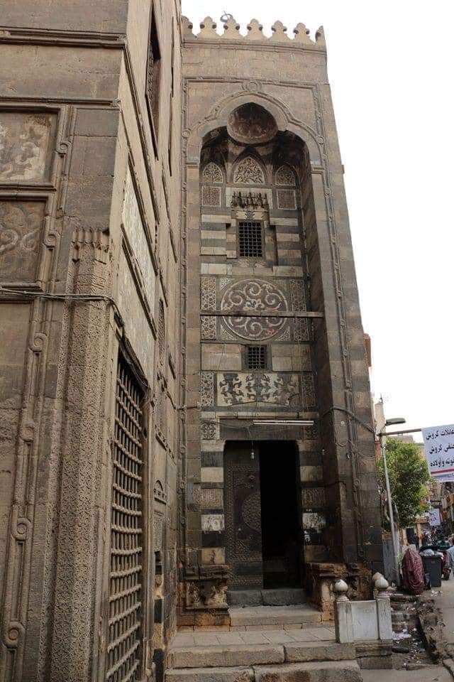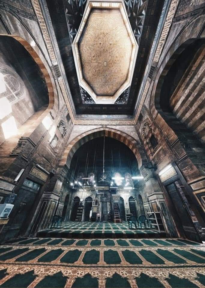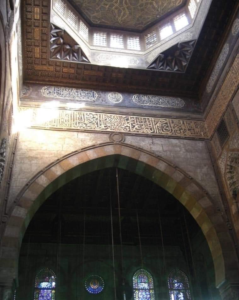 7-وكتابة قرآنية بالخط الكوفي المزهر وقد سجل الصانع اسمه بتجويف المحراب: "عمل عبد القادر النقاش"بجوار المحراب منبر نادر من الخشب المطعم بالعاج وللمسجد أربع واجهات أهمها الواجهة التي تطل على شارع الدرب الأحمر والتي أحدث بها المعماري عدة انكسارات للتماشي مع خط تنظيم الطريق 👇