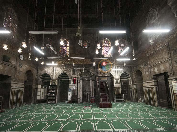 11-ويتوسط إيوان القبلة محراب رخامي غاية في الروعة والجمال ويجاوره منبر خشبي تزينه الأطباق النجمية ومطعم بالعاج وتشغل الجدران العلوية للمسجد نوافذ مغشاة بشبابيك من الجص المفرغ المعشق بالزجاج الملون وأرض المسجد مفروشة بالرخام الملون.