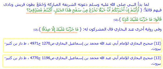 كما قد شهدت له قريش ايضا بانه "صادق"، حيث لما بدأ النبي صلى الله عليه وسلم دعوته الشريفة المباركة وَجَمَعَ بطون قريش ونادى فيهم قائلاً:"شاهد الصورة المرفقة"