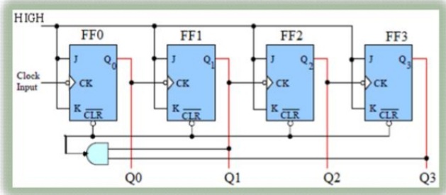 ☆ يستخدم خرج بوابة NAND كنبضة مسح لجميع القلابات لإعادة العداد إلى الوضع 0000 و هذا يحدث عند تغيير القيمة من 1010 إلى 1011