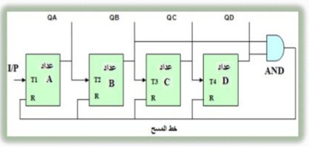 * و تستخدم إشارة بوابة AND لإعادة العداد إلى الوضع ( 0000) أي تصفير العداد و هذا يحدث عند تغيير القيمة من (1001)إلى ( 0101).