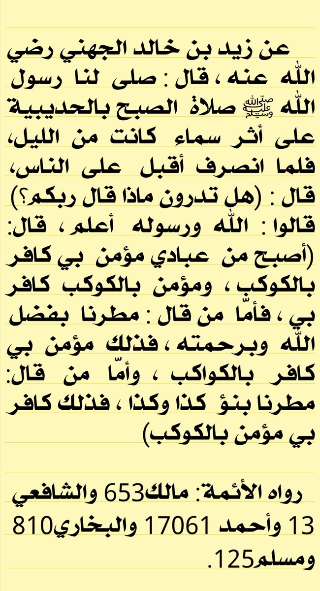 قال: "كان ناس يمطرون فيقولون: مطرنا بنوء كذا، مطرنا بنوء كذا"