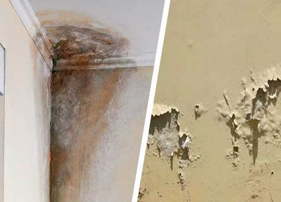 من مسببات الرطوبة : وجود تسريبات ف انابيب المياه داخل الجدار و كذلك تسريبات السقف لمياه الامطار او اي مياه متجمعة فوقه بسبب عطل العازل المائي او غيابه، كذلك ارتفاع منسوب المياه الجوفية قد تؤدي الى ارتفاع الرطوبة للجدران من الارض،