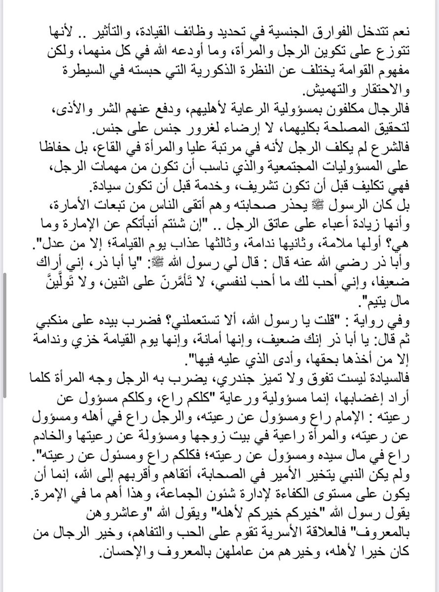 متطرفة بعكس حماسها اللافت في إثبات أن المرأة لها قوامة في الإسلام! كان المتدثرات يكتبن سابقا: القوامة تكليف لا تشريف، واليوم أصبحت "تكليف قبل أن تكون تشريف"، هي هي، تقول: إن الشرع لم يكلف الرجل بالقوامة لأنه في مرتبة عليا والمرأة في القاع، أقول: انظروا إلى تجييش العواطف والتطرف..