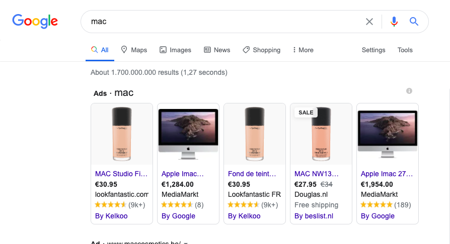 يعني لما نبحث في جوجل عن منتج معين، أو كلمة مفتاحية مرتبطة بمنتج ما، النتائج الظاهرة رقم 1⃣ في الشريط العلوي هي أصحابها روجوها بحملات مدفوعة من جوجل، أما المنتجات التي تظهر بعد ذلك🔽، تكون من متاجر فقط مسجلة في ميرشنت ولكنها لا تروج لمنتجاتها بحملات مدفوعة مثل النتائج الأولى.