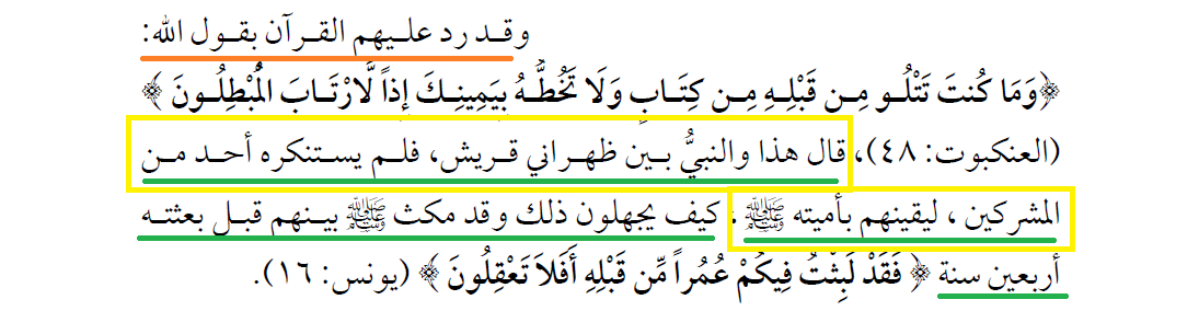 (4/11)وكانت أمِّية النبي"صلى"حجر العثرة الذي أعثر أصحاب الأباطيل الزاعمين أن النبي"صلى"نقل من كتب السابقين وعلومهم وقد رد عليهم القرآن بقول الله{وَمَا كُنتَ تَتْلُواْ مِن قَبْلِهِۦ مِن كِتَٰبٍۢ وَلَا تَخُطُّهُۥ بِيَمِينِكَ ۖ إِذًا لَّٱرْتَابَ ٱلْمُبْطِلُونَ}(العنكبوت: 48)