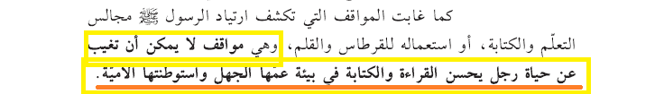 (6/11)وقد كانت المرحلة المدنية من الدعوة متميزة بالحاجة الى الكتابة بصورة خاصة، مع ظهور مراسلات الملوك، وتنظيم الجيش، والدولة،حتى انه كان للرسول"صلى"واحد وستون كاتبا، ومع ذلك لم يظهر في هذه المرحلة(المعرفة المزعومة) للرسول "صلى" بالقراءة والكتابة.