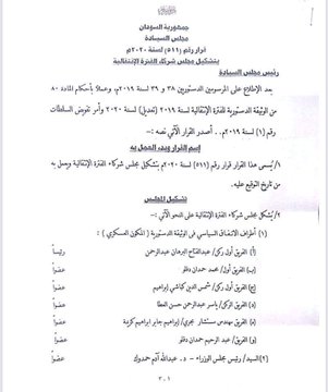 أعلن رئيس مجلس السيادة ، الفريق اول ركن عبد الفتاح البرهان، عن تشكيل مجلس شركاء الفترة الانتقالية مكون من (29) عضواً وهم: الفريق اول عبد الفتاح البرهان والفريق أول شمس الدين كباشي والفريق ياسر العطا والفريق ابراهيم جابر والفريق عبد الرحيم دقلو ودكتور عبد الله حمدوك