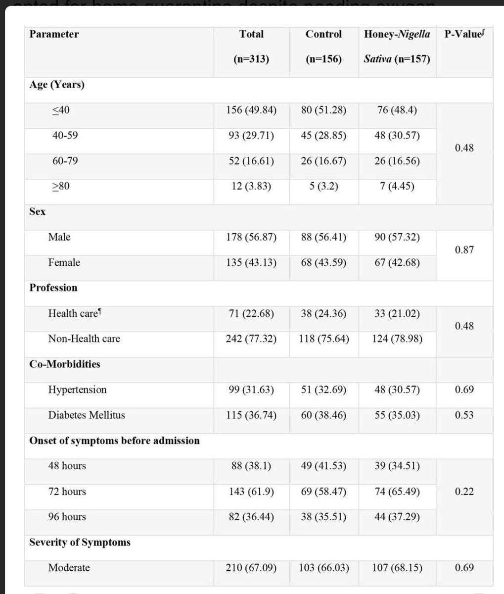 (١٢/٤)تحليلي لهذه الدراسة: توقيتها مهم جدا .. إلى الآن لايوجد علاج ومئات الدراسات تحاول ايجاد اي علاج يخفف الاعراض والتخلص من الفيروس..فكرة الدراسة مهمة جدا ايضا وهي استخدام العسل والحبة السوداء لمجموعة من المرضى مقارنة مع مجموعة لم تستخدمها ..