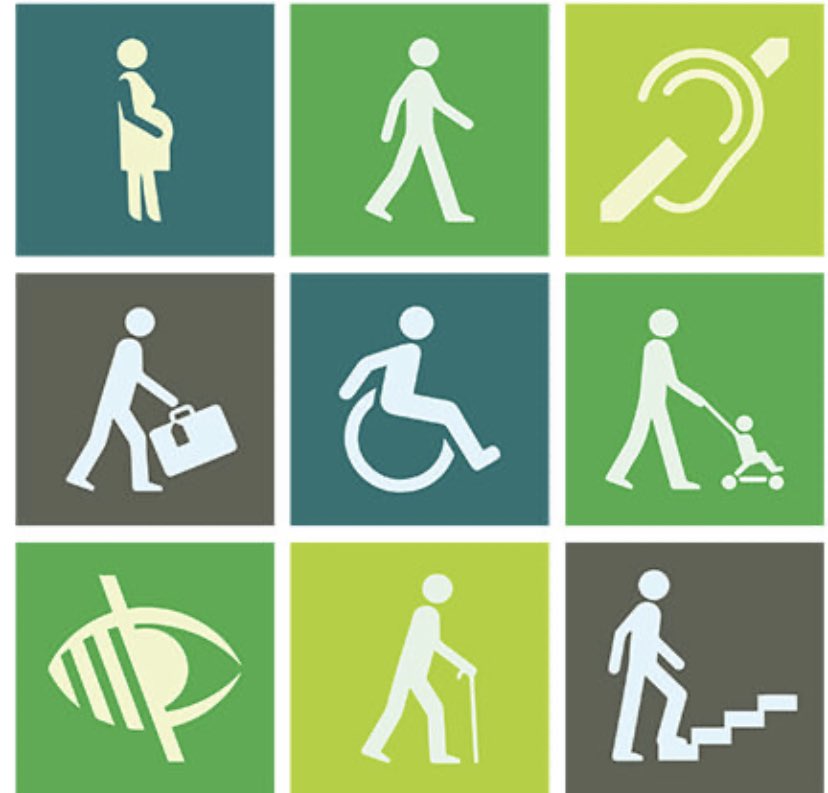 المداخل ( الابواب)في الاسواق والمتاجر: يجب ان تكون مصممه لتسمح ليس فقط بدخول عربات ذوي الاحتياجات بل حتى عربات الاطفال وشنط السفر ، تزود كل المداخل باضاءات حتى تكون واضحه للجميع حتى لضعيفي النظر وان لا يكون هناك اي عوائق تمنع حركه العربات