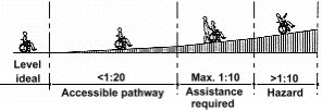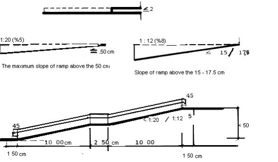 في حاله ان مدخل المتجر مرتفع عن مستوى الارض ، يجب تصميم منزلق بنسبة ١:٢٠ عند المداخل والمخارج