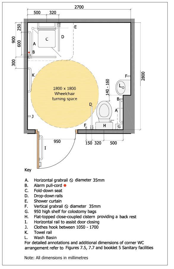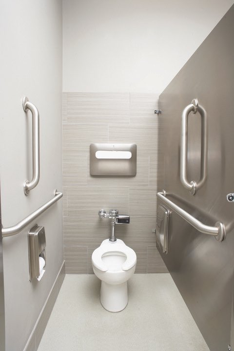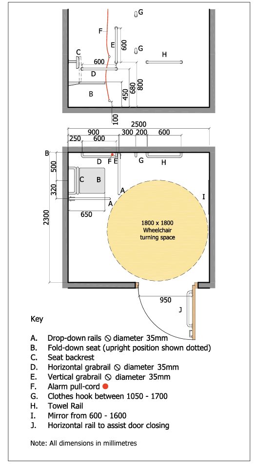 دورات المياه : مساحات اكبر لتسمح بسهوله التحرك بعربه ذوي الاحتياجات الخاصه ، هنا التصميم العالمي لدورات المياه الخاصه بذوي الاحتياجات