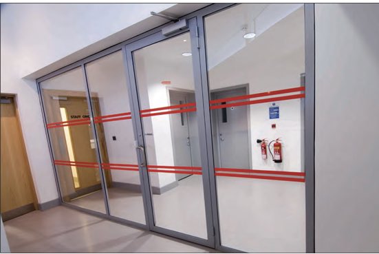 اضافه شريط باللوان واضحه تثبت على الواجهات الزجاجيه القريبه من المداخل والمخارج للتنبيه وتفادي الارتطام بها