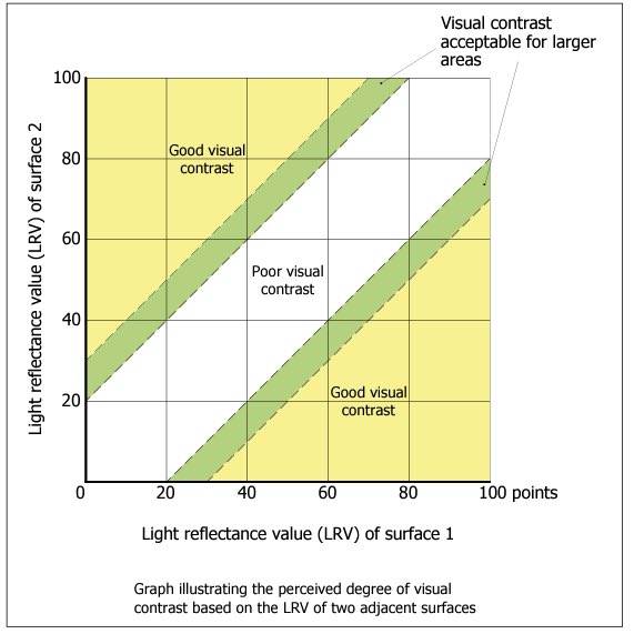 يجب ان تكون الارضيات غير زلقه وذات الوان واضحه ، اضافه الوان واضحه في الارضيات ترشد للمداخل والمخارج لتسهل لضعفي النظر من معرفه الطريق