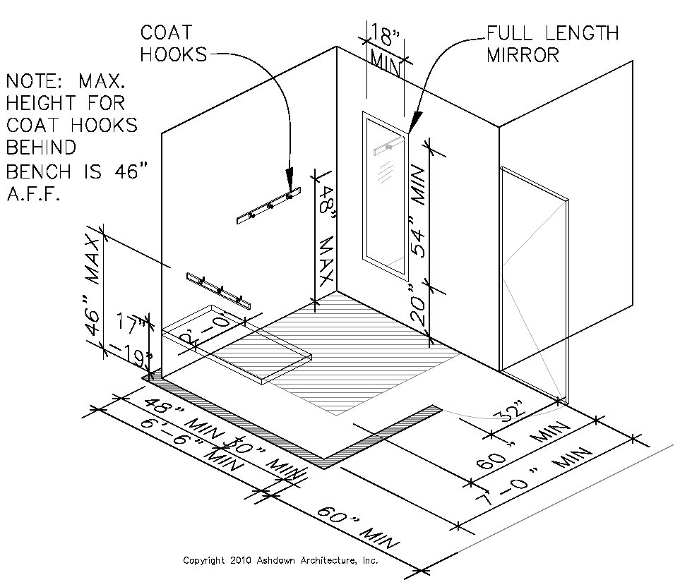 غرفه تغيير الملابس في معارض البيع ، يجب ان توفر غرفه خاصه بكبار السن وذوي الاحتياجات الخاصه ، بمقاس لا يقل عن ٢.٥ *٢.٥ مزوده بكرسي قابل للطي ومقابض مثبته على الجدار
