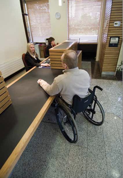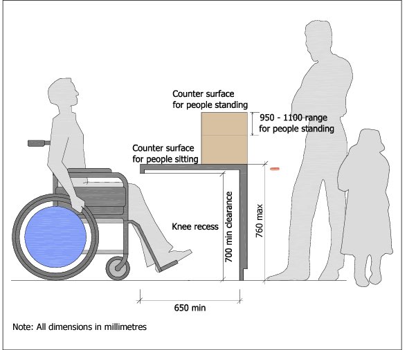 صناديق البيع و مكاتب الاستفسارات في المتاجر والخدمات العامه يجب ان توفر طاولات بمستوى يناسب من هم على عربات ذوي الاحتياجات الخاصه , الارتفاع المناسب هو ٧٦ سم