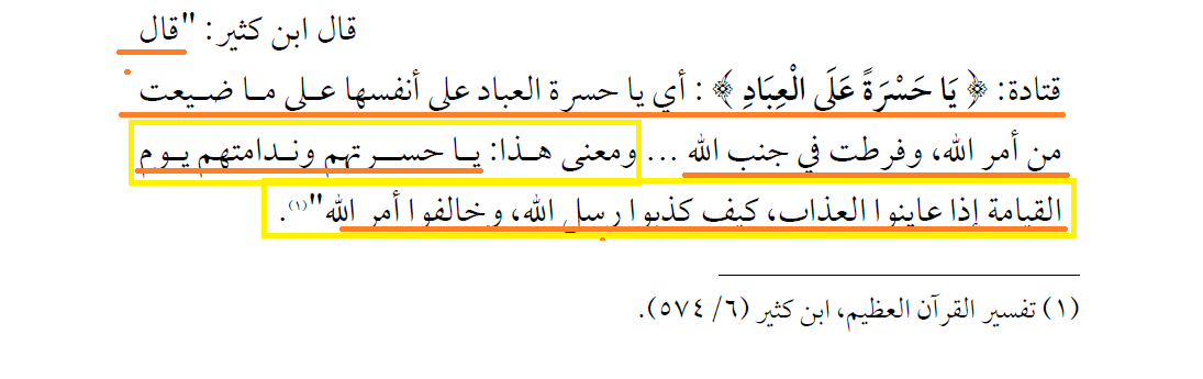 (3/6)فهذا أولى له من التحسر الذي يصنعه من لا يملك حيلة ولا دفعاً لما يتحسر عليه. وهذا المعنى فهمه مفسرو الإسلام ونقلوه عن التابعين، قال ابن كثير: قال قتادة:{يَا حَسْرَةً عَلَى الْعِبَادِ} أي يا حسرة العباد على أنفسها على ما ضيعت من أمر الله،وفرطت في جنب الله...